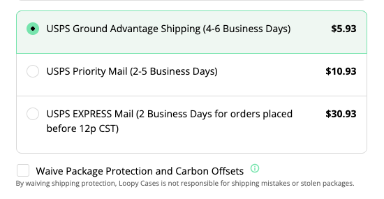 Don’t want package protection? You can remove it during checkout before completing your order by clicking the checkmark next to "Waive Package Protection and Carbon Offsets". We'll include a screenshot below of where to remove this protection at checkout.